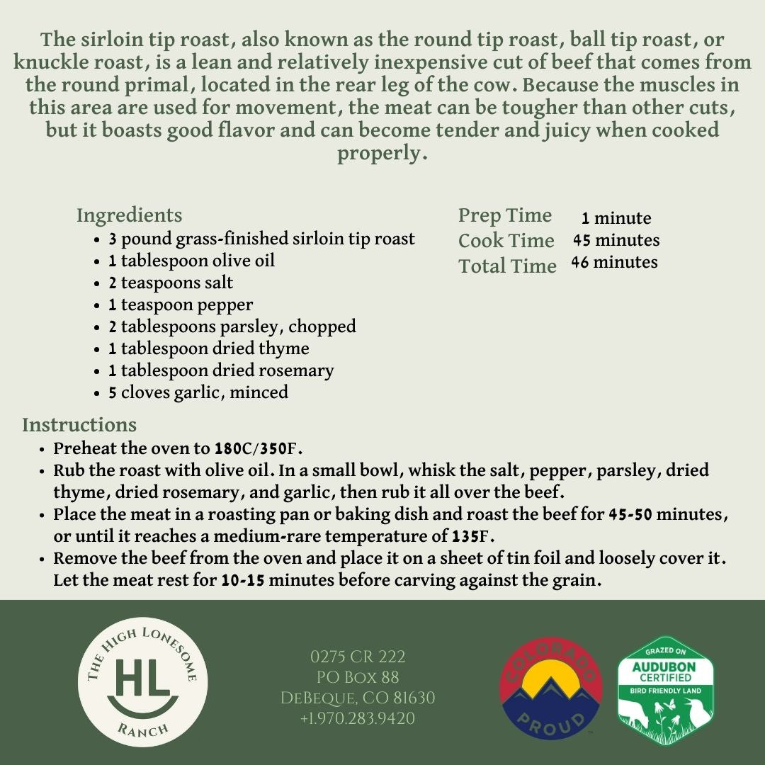 The sirloin tip roast, also known as the round tip roast, ball tip roast, or knuckle roast, is a lean and relatively inexpensive cut of beef that comes from the round primal, located in the rear leg of the cow. Because the muscles in this area are used for movement, the meat can be tougher than other cuts, but it boasts good flavor and can become tender and juicy when cooked properly. Here's a breakdown of what you should know about sirloin tip roast: